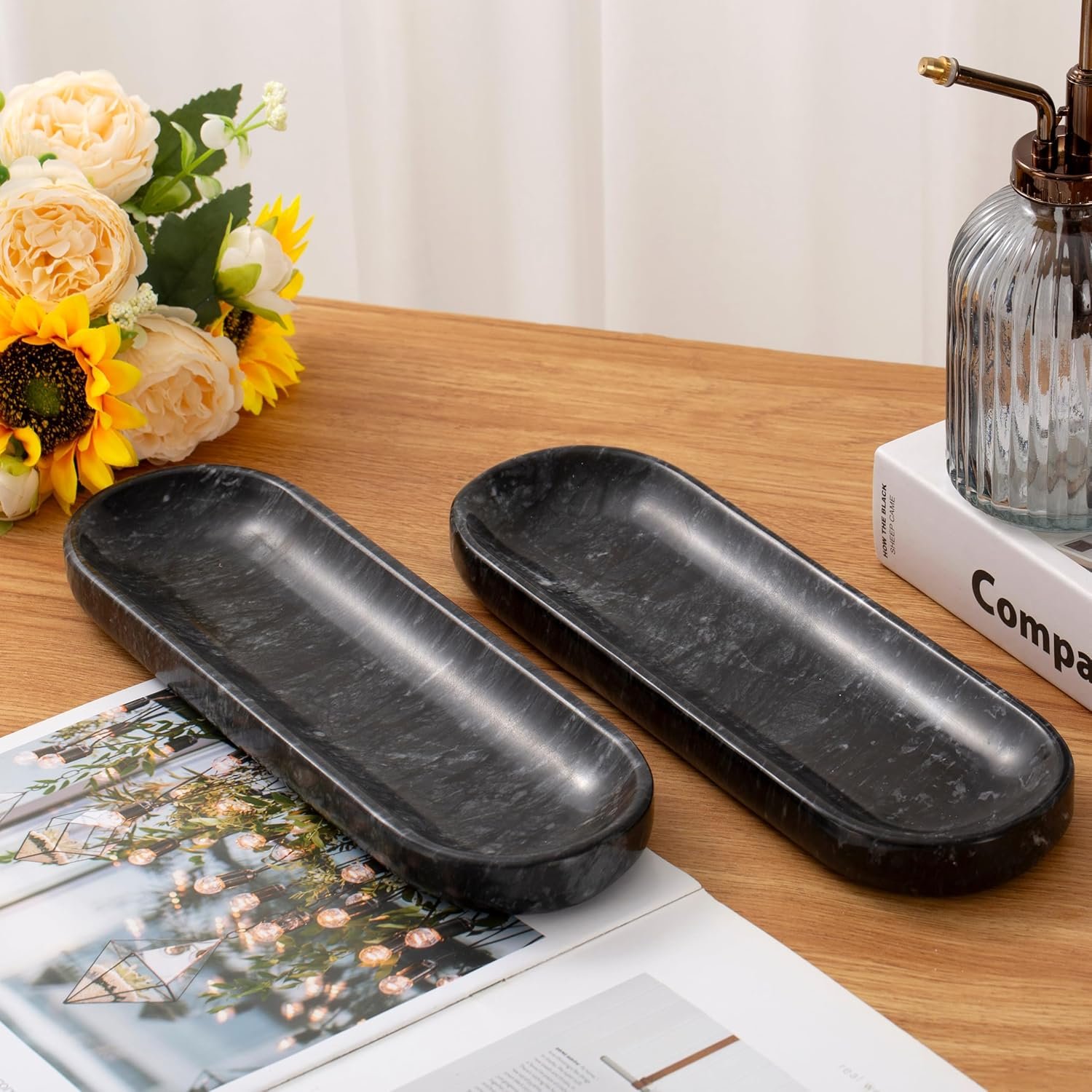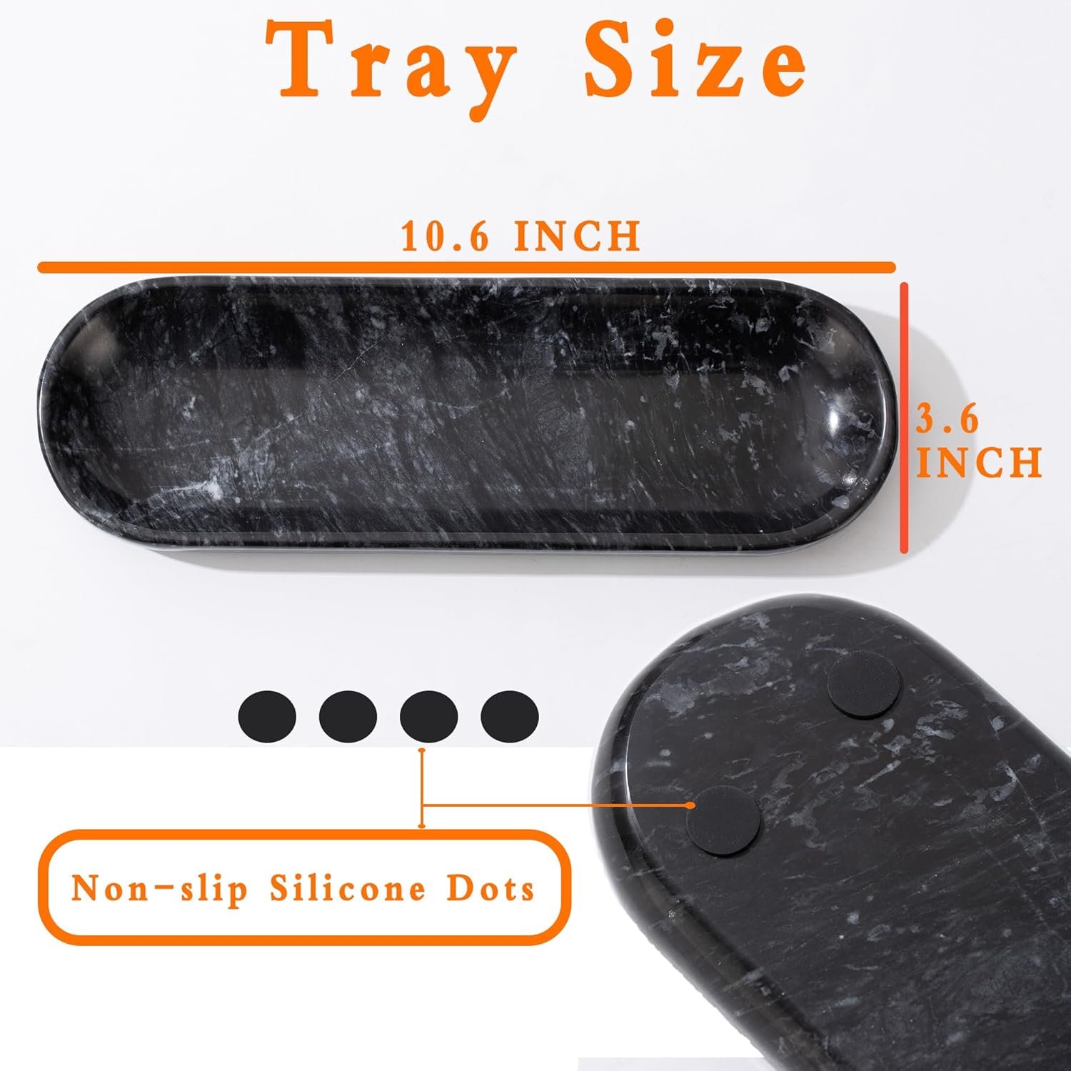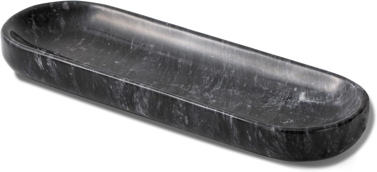 Love the long oval marble tray. Looks perfect on nightstand to hold jewelry, eyeglasses or remote.