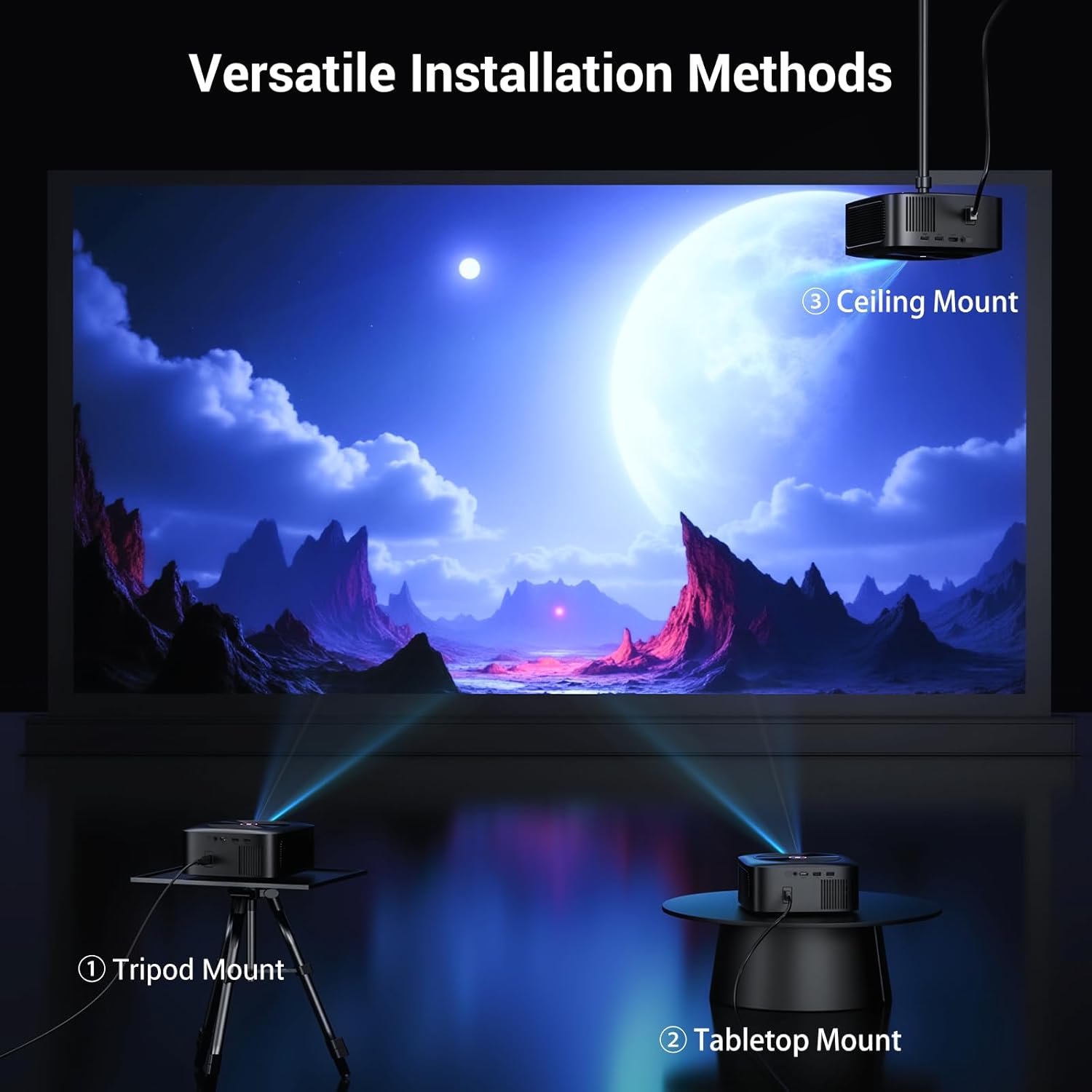 ‎Brightness: 1500 ANSI (38,000 Lumens) Resolution: Native 1080P Full HD, supports 4K input Contrast Ratio: 2000:1 with HDR10+ Projection Size: 50"–200" Zoom: 50%–100% digital zoom Smart Adjustment: Auto focus & auto keystone correction Wireless: Dual-band 5G/2.4G WiFi 6 Bluetooth: Two-way Bluetooth 5.2 Casting: Supports Google Cast, AirPlay & Google Phone Mirroring Audio: Hi-Fi speakers with Dolby Audio Cooling: Advanced low-noise cooling system Lamp Life: 10,000 hours durable LED light source |