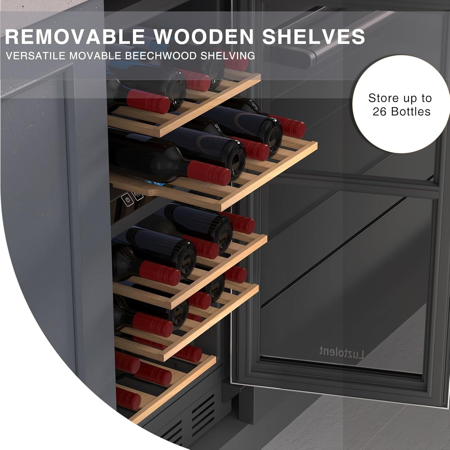 1x Luztolent 26 Bottle Dual Zone Wine Cooler, 1x Stainless Steel Door Handle, 1x User Manual, 6x Beech Wood Shelves |