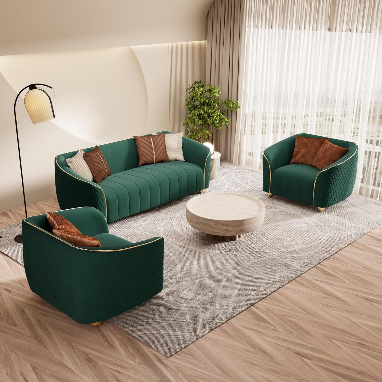 1 review for 3-Piece Luxury Velvet Sofa Set for Living Room, Elegant Design Couch Set with Curved Armrests and Gold Edge Trim, Tufted Upholstered Couch with Gold Metal Legs (Green, 3+1+1 Set)