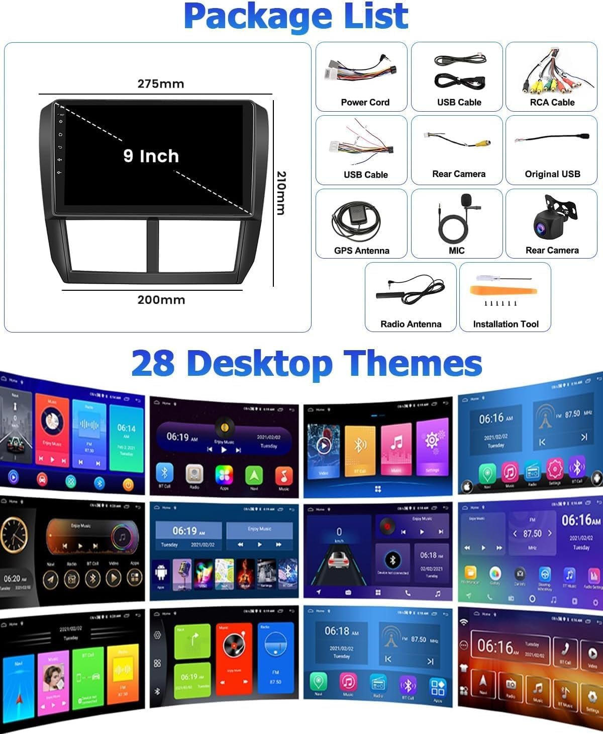 Android 15 System,2+64GB, 9 inch, Bluetooth, Touchscreen, Wireless/Wired CarPlay & Android Auto, GPS Navigation, WiFi Connection, Mirror Link, FM RDS Radio, 28 Desktop Themes, Steering Wheel Control, Backup Camera Input