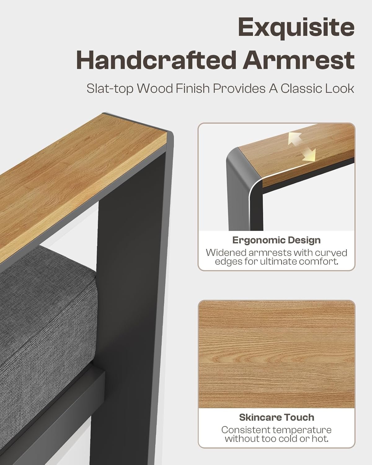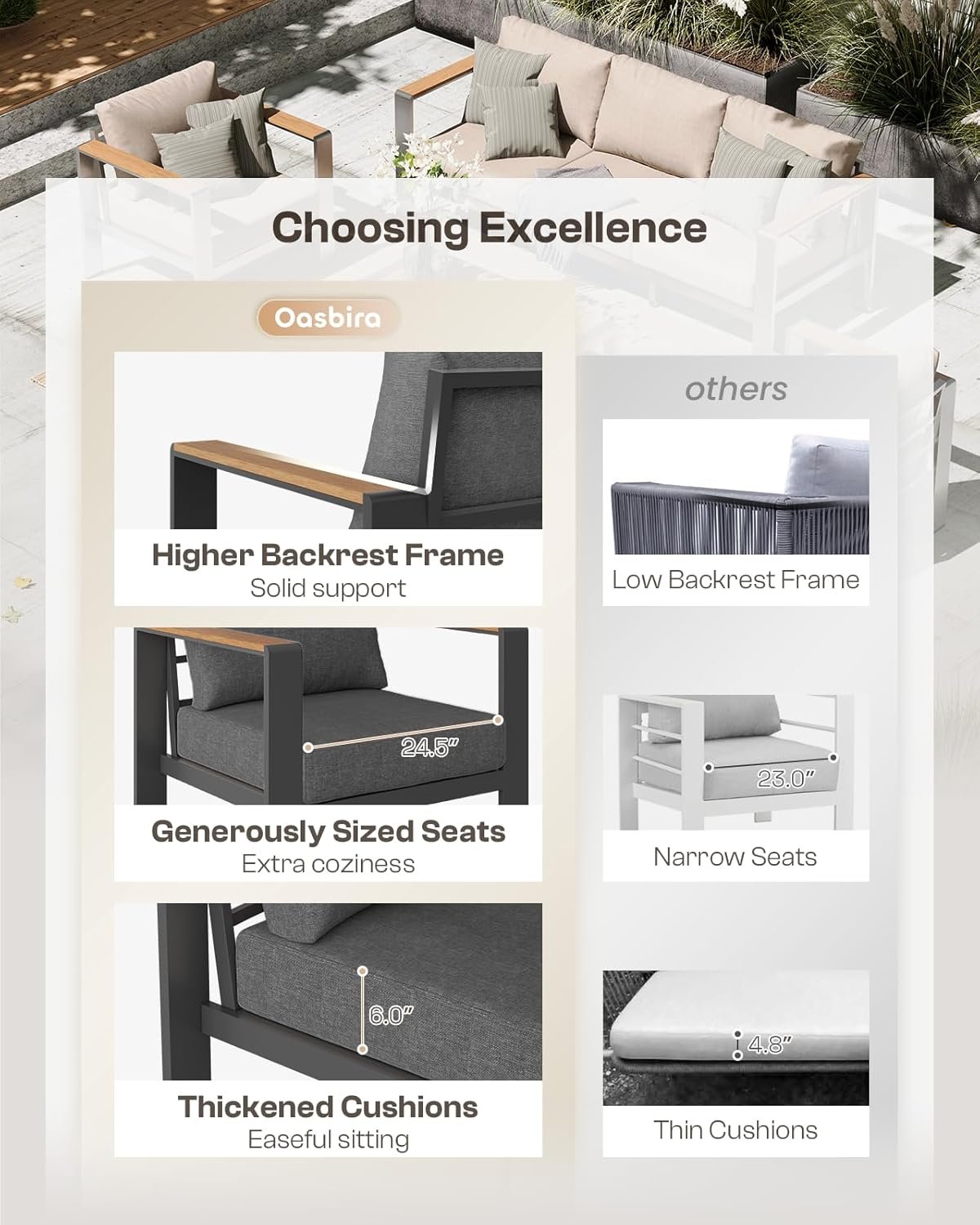 I’m extremely happy with this furniture set. It’s modern, durability, and comfortable. The aluminum frame is solid, and rust-resistant. It feels sturdy without being heavy. The powder-coated finish looks sleek and hasn’t shown any signs of fading or chipping.The cushions are thick, supportive, and well-made, providing great back support for long sitting.I would highly recommend it to anyone looking for an attractive outdoor furniture set.