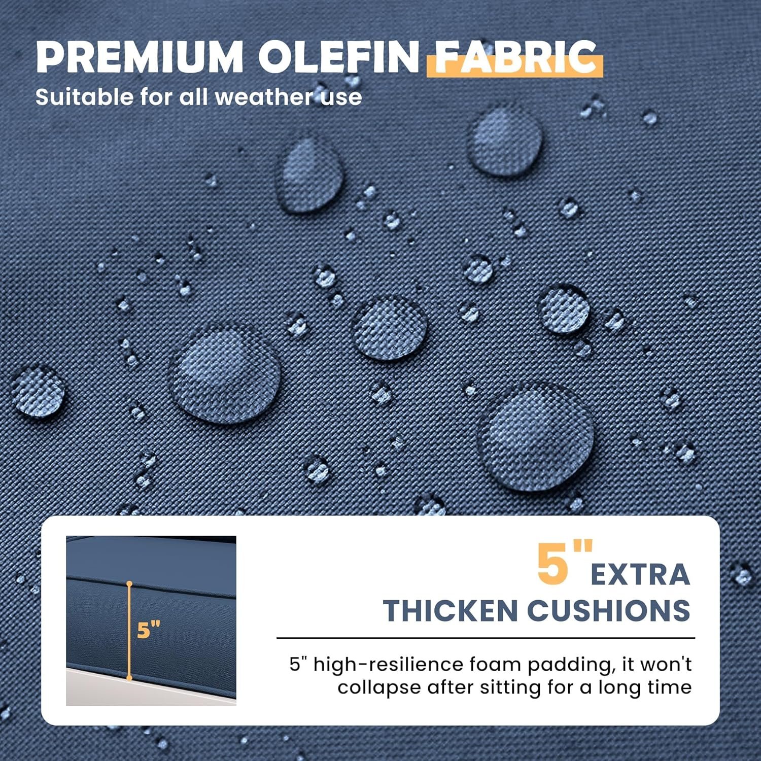 This is a great patio set. The blue/gray combo is very attractive. It’s sturdy yet light weight. It assembles easily, as I did it by myself. The bottom cushions are very nice, although the back cushions are a bit skimpy. I plan on adding foam to add fullness. It still deserves 5 stars. There was one leg piece from the coffee table that was dented. Customer service was very quick to respond and shipped a replacement piece which arrived in about one week. I recommend this patio set.