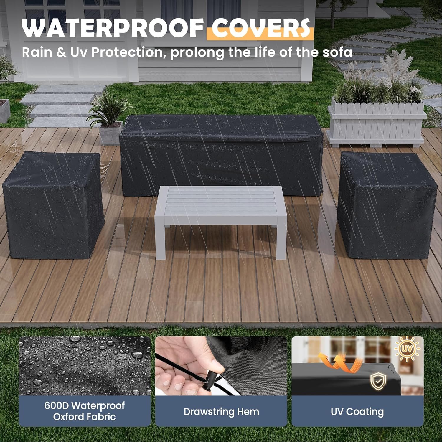 I bought my patio furniture in June, and the protective covers have already split open. I have only used the furniture twice and have kept it covered. The waterproof covers, designed wiith water-resistant top fabric with an added waterproof undercoating to protect your outdoor sofa from natural damage and outdoor elements like sun, dirt, rain, snow. But has failed under less then normal use. Fir the amount if money I paid for this set I woud have exspected the covers to last several years… very disappointed….. not sure if i can get replacement covers for it