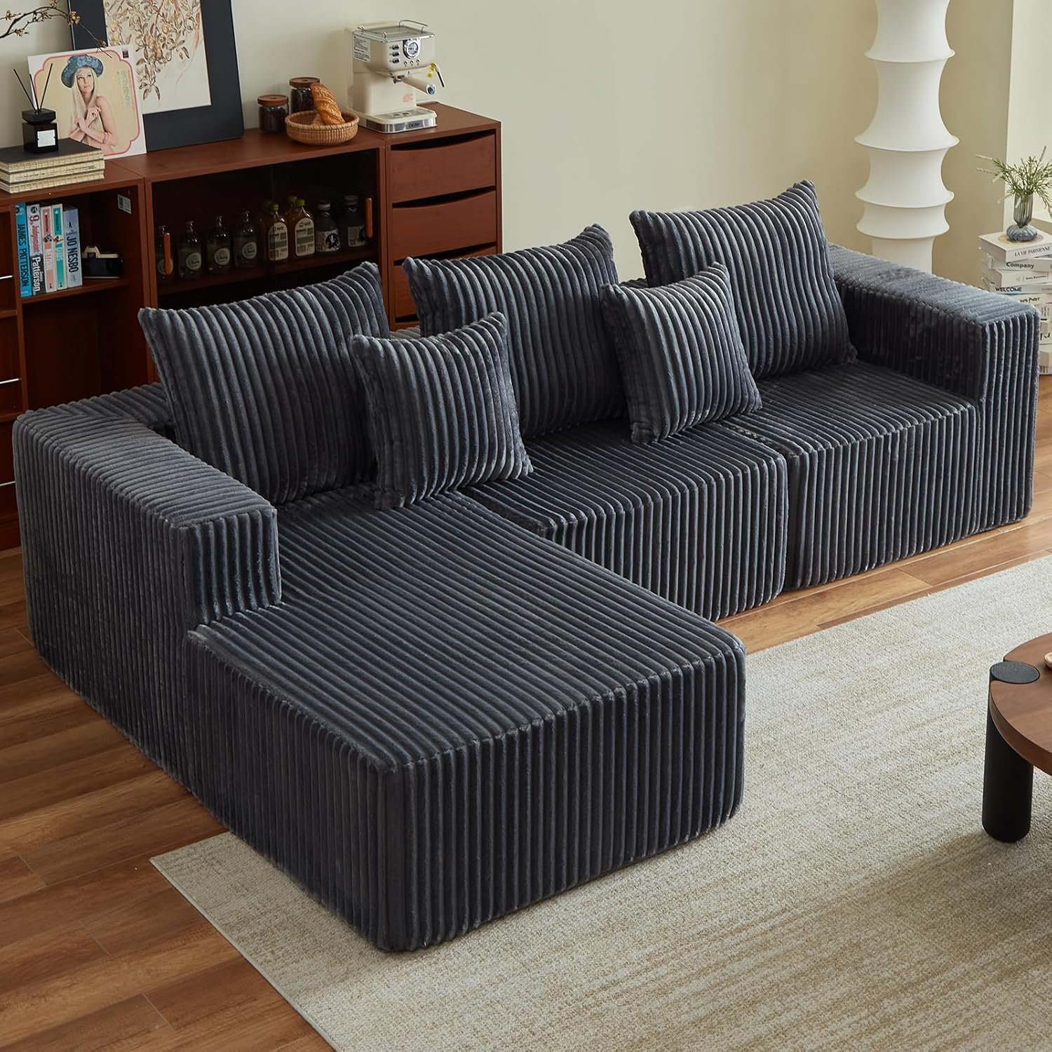 I was hesitant to buy a couch online, especially one that comes compressed in a box, but this 102″ sectional has exceeded all my expectations! The “no assembly required” feature was absolutely true – it literally expands within hours of unboxing, and you’re ready to relax.The cloud couch design lives up to its name. The oversized deep seats are incredibly comfortable and perfect for lounging. The boneless design means no uncomfortable hard frames poking you, and you can truly sink into the cushions. It’s like sitting on a cloud! The corduroy fabric in beige is soft, durable, and adds a modern touch to my living room.The L-shaped configuration is ideal for my apartment and makes the most of my space. I was worried about the size, but it fits perfectly and doesn’t overwhelm the room. The modular design also means I could potentially reconfigure it in the future if needed.For the price point, the quality is outstanding. The fabric feels premium, the cushions have great support despite the plush feel, and the construction seems solid. I’ve had it for a few weeks now, and it still looks and feels brand new.If you’re looking for a comfortable, stylish sectional that won’t break the bank and fits perfectly in apartments or smaller living rooms, this is it. The compressed shipping made delivery so much easier too – no struggling to get a massive couch through doorways!Highly recommend this purchase!