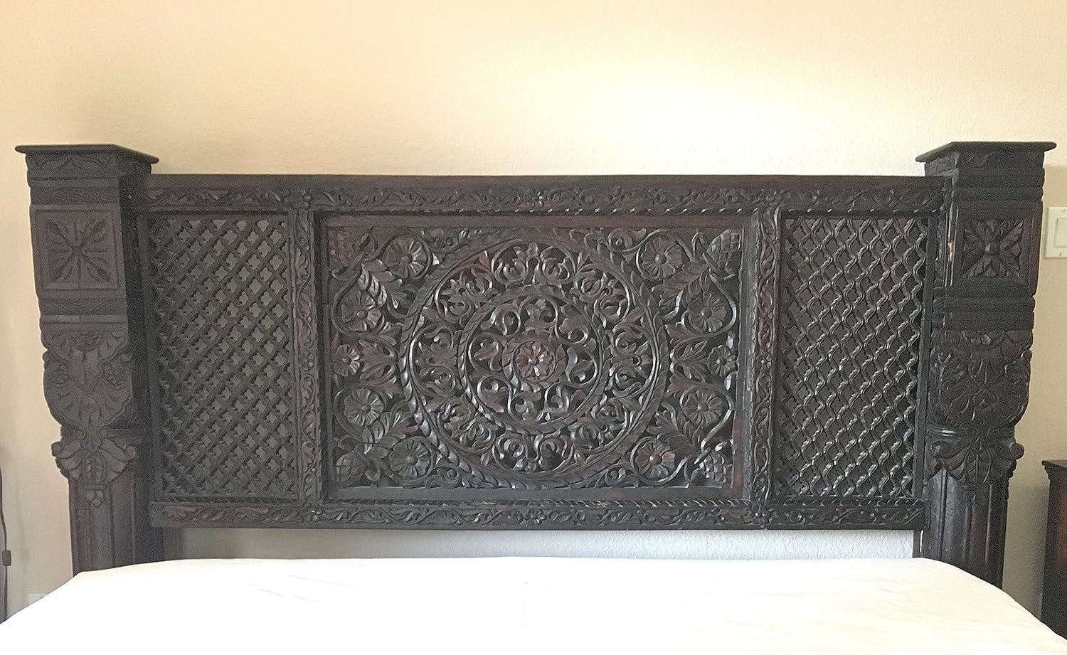 ‎8" solid wood pillars, Floral Intricate Footboard, Mandala Carved Design, Solid Neem Wood of the Mahogany Family, Symmetrical Lotus Flower Headboard |