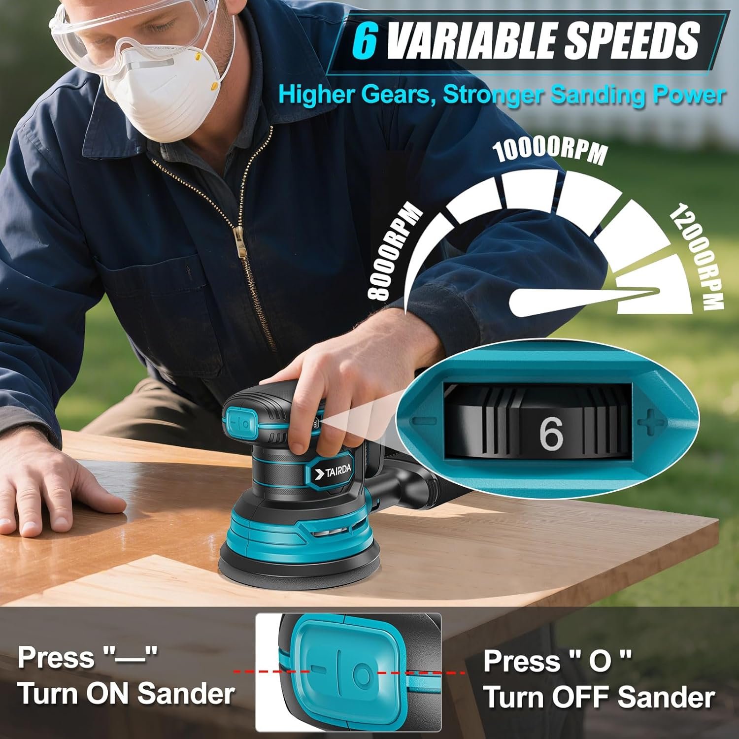 The on/off switch is recessed and covered by a soft rubber protective cap which makes it a bit clumsy to turn on and off. But the sander works fine and the speed dial is functional.