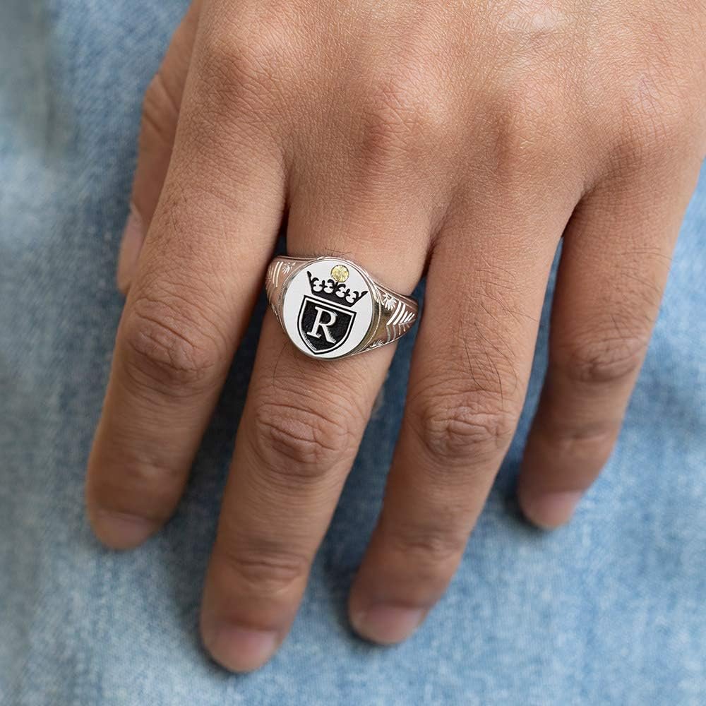 Getname Necklace Initial Signet Ring Sterling Silver King Crown Monogram Ring – Custom Engraved Alphabet Rings for Man – Personalized Mens Signet Ring Silver Gold