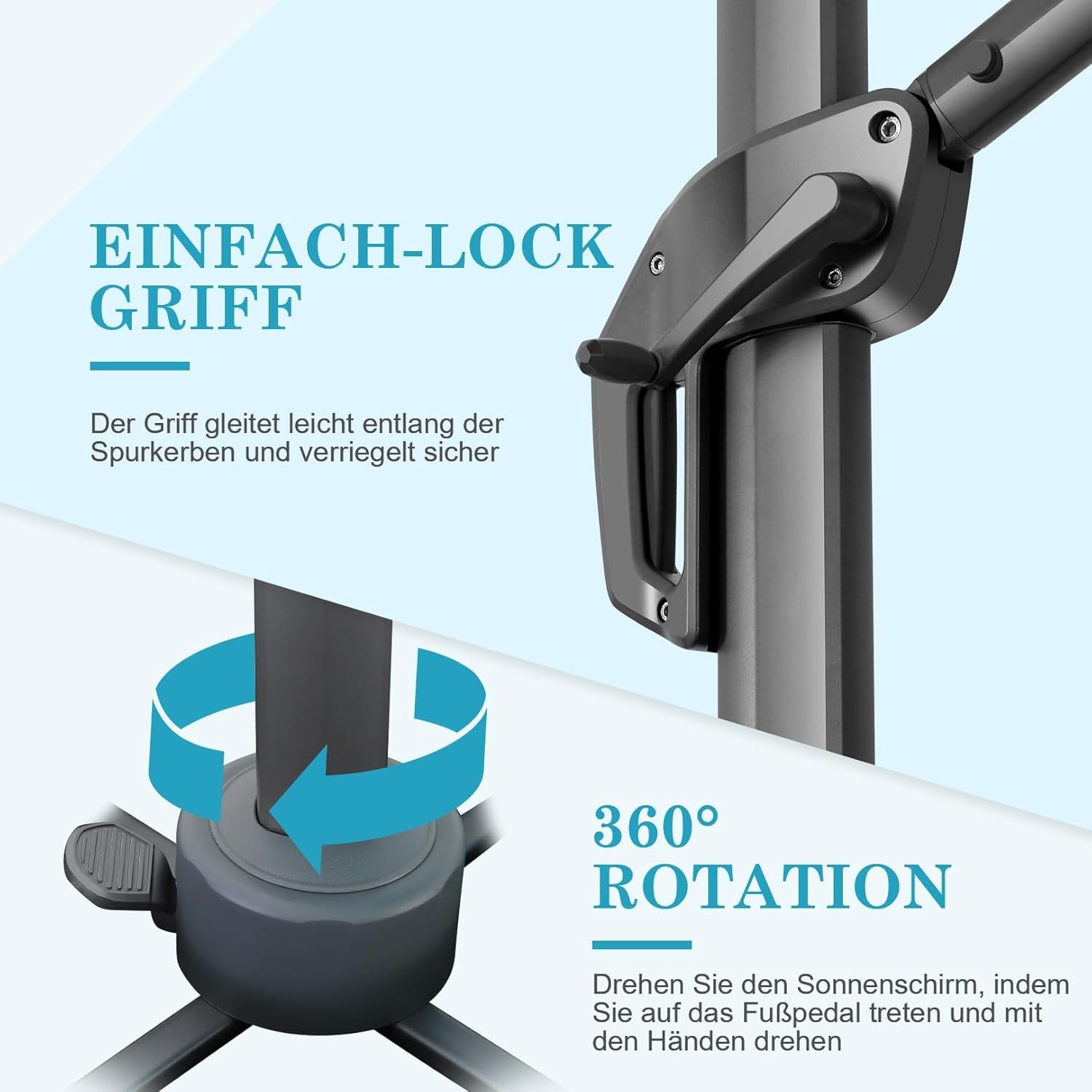 Awesome umbrella! I love how to turns and adjusts! You will have to purchase a base separately, but it’s great. The only thing to watch for is where you place it. I put mine on our back deck. The deck is not huge, so I have to swing it in a different direction as I’m setting it up and taking it down as the patio furniture gets in the way of it. Luckily I can do this though because the function of the umbrella lets me. This umbrella has been a game changer. I can finally enjoy my deck! Highly recommend!