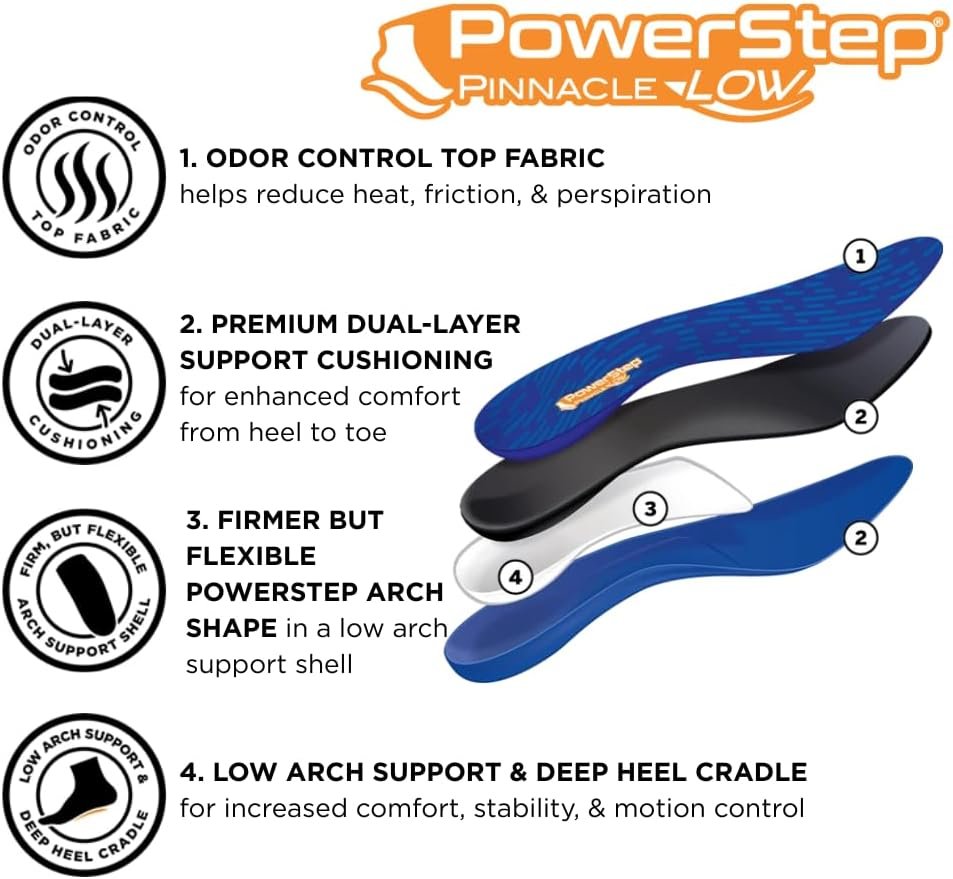 The PowerStep Pinnacle Low Arch Insoles are a game-changer for anyone with flat feet or low arches. These insoles provide the perfect balance of comfort, support, and relief, making them an essential upgrade for daily footwear.Why These Insoles Stand Out:Low Arch Support Design:Specifically designed for flat feet or low arches, these orthotics provide targeted support to alleviate foot strain and overpronation. Since using them, I’ve noticed reduced discomfort in my feet, knees, and lower back after long days of walking or standing.Cushioning for All-Day Comfort:The dual-layer cushioning absorbs impact and provides incredible comfort. Whether I’m running errands, walking my dog, or working a long shift, my feet feel significantly less fatigued.Pain Relief for Common Issues:These insoles have been a lifesaver for my plantar fasciitis. They provide gentle but effective support that minimizes pain and keeps my feet aligned properly.Versatile Fit:They’re easy to insert into a variety of shoe styles, from sneakers to casual shoes. The slim design doesn’t crowd my shoes or alter their fit.Durable and Reliable:The materials feel high-quality, and after weeks of daily use, the insoles have maintained their shape and support.Key Benefits I’ve Experienced:Pain Relief: Significant reduction in foot and heel pain.Improved Posture: My feet feel more aligned, which has helped improve my overall posture.Enhanced Activity Levels: I feel more comfortable staying on my feet for longer periods.Things to Consider:These insoles are specifically designed for low arches, so they may not be suitable for those with high arches.They take a day or two to break in and adapt to your feet.Final Verdict:The PowerStep Pinnacle Low Arch Insoles are a fantastic solution for anyone struggling with flat feet, plantar fasciitis, or general foot discomfort. They’ve transformed my daily routine by making every step more comfortable and supported.If you’re looking for a reliable and effective insole for low arches, these are absolutely worth it. Highly recommended for both men and women seeking pain relief and all-day support!