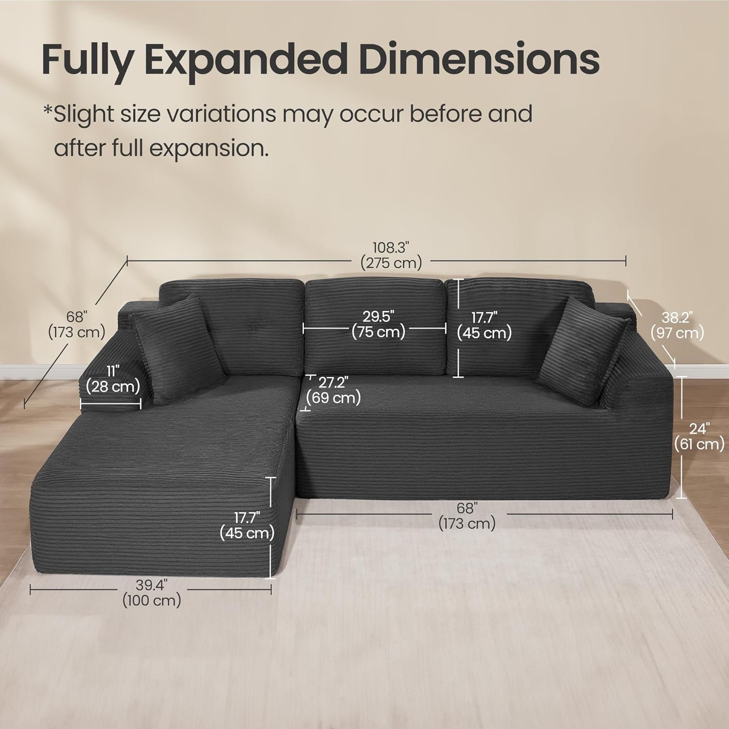 Modern Cloud Couch with Deep Seat, Corduroy Sofa for Living Room, Bedroom, Modular Sectional Sofa with Left-Facing Chaise, 108.3 Inches, Slate Gray ULCS181GN01 |