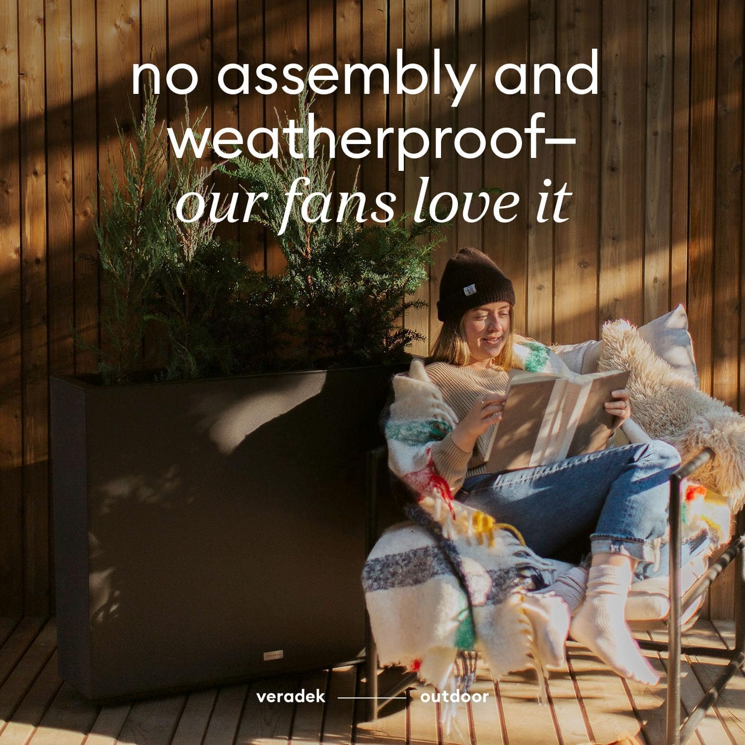 The planters are beautiful for creating a little penthouse look on my balcony. I bought the large 30″ high by 38″ wide and only 8″ width; narrow and sleek. Felt a little flimsy at first, but not after I weighted them. I face ACNJ and am in a condo. I wanted to elevate the space and create some privacy from the street also; I’m on the third and fourth floors. They looking stunning from the inside as well. They were light enough to maneuver into place by myself. I weighted the bottom section with bags of peagravel. I left the gravel in the bags. The top inserts were weighted with 6x6x1 pavers placed on their sides and then I added 4 faux cedar trees 3.5 feet high per planter; they pushed into place perfectly. If god forbid a hurricane with super high winds, I can disassemble and bring inside without worrying about dragging in loose stones or soil into my unit. So far they have been through 30 mph winds and heavy rain and were fine. I did not use the plugs and had no problem with drainage or excessive water on the balcony at all. The only con is they are expensive, but well worth the look. I love them! Thanks, Veradek! ❤️🥳 #myveradek